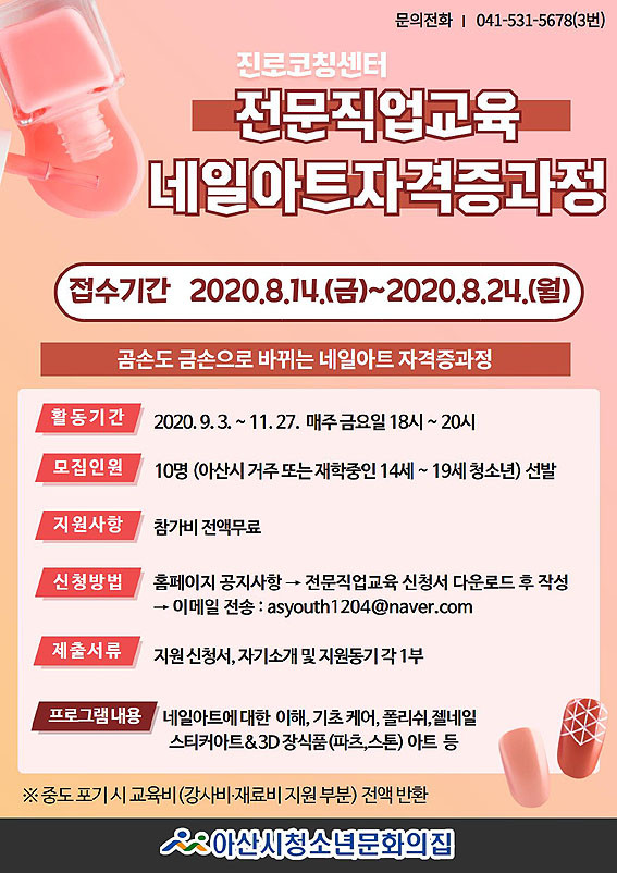 ¾Æ»ê½Ã(½ÃÀå ¿À¼¼Çö)¿Í ¾Æ»ê½Ãû¼Ò³â¹®ÈÀÇÁý(°üÀå Áö¸í±Ù)ÀÌ ¿À´Â 8¿ù 24ÀϱîÁö Àü¹®Á÷¾÷±³À° ¡®³×ÀÏ¾ÆÆ® ÀÚ°ÝÁõ°úÁ¤¡¯ Âü°¡ÀÚ¸¦ ¸ðÁýÇÑ´Ù.
