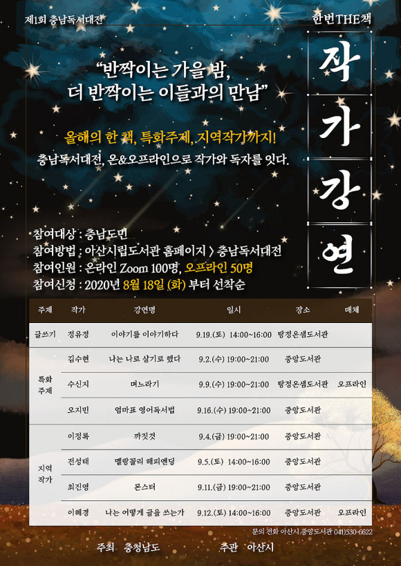 ¡®ÀÛ°¡°¿¬¡¯Àº µµ¼°ü ÇöÀå Âü¿©¿Í ÇÔ²² ¿Â¶óÀÎ ¹æ½ÄÀ» Á¢¸ñÇØ »çȸÀû °Å¸®µÎ±â·Î ÁöÄ£ Ãæ³²µµ¹ÎµéÀÌ Áý¿¡¼ ¾ÈÀüÇÏ°Ô Æò¼Ò ÁÁ¾ÆÇß´ø ÀÛ°¡¿Í ¼ÒÅëÇÒ ¼ö ÀÖ´Â ±âȸ¸¦ Ãß°¡·Î Á¦°øÇÑ´Ù. ÇöÀå Âü¿© 50¸í, ¿Â¶óÀÎ Âü¿© 100¸íÀ» ¼±Âø¼ø ½Åû ¹Þ´Â´Ù.