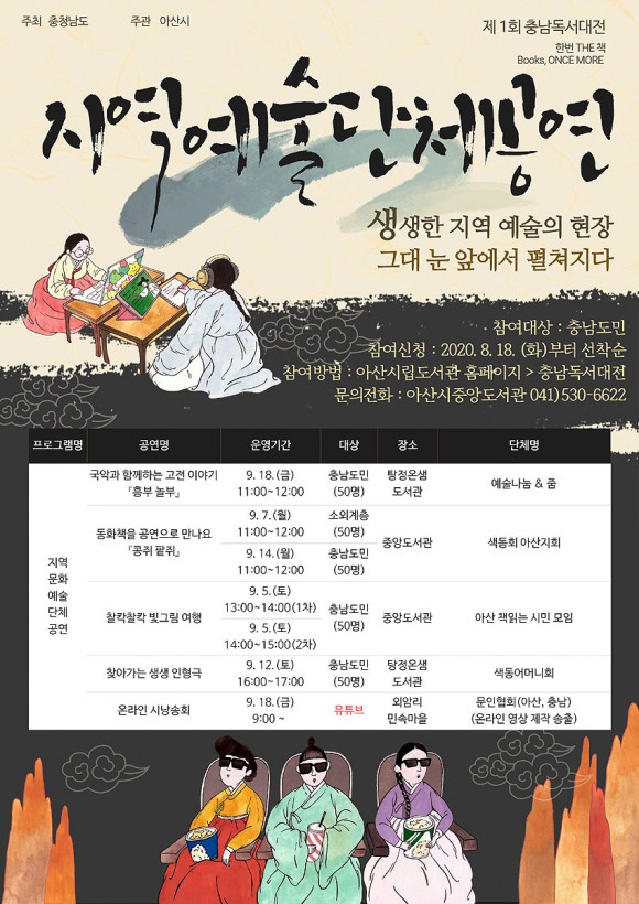 ¡®Áö¿ª¹®È ¿¹¼ú´Üü °ø¿¬¡¯Àº ¡ã¿¹¼ú³ª´®&ÁÜ(±¹¾Ç°ú ÇÔ²²ÇÏ´Â °íÀüÀ̾߱â ÈïºÎ³îºÎ) ¡ã»öµ¿È¸ ¾Æ»êÁöȸ(µ¿ÈÃ¥À» °ø¿¬À¸·Î ¸¸³ª¿ä ÄáÁãÆÏÁã) ¡ã¾Æ»ê Ã¥Àд ½Ã¹Î ¸ðÀÓ(ÂûĬÂûĬ ºû±×¸² ¿©Çà) ¡ã»öµ¿¾î¸Ó´Ïȸ ¾Æ»êÁöȸ(ã¾Æ°¡´Â »ý»ýÀÎÇü±Ø) ¡ã¹®ÀÎÇùȸ ¾Æ»ê¡¤Ãæ³²ÁöºÎ(¿Â¶óÀÎ ½Ã³¶¼Ûȸ)·Î ±¸¼ºµÆ´Ù.