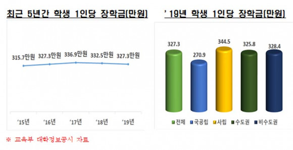 ÀÌ ÀÚ·á¿¡ µû¸£¸é Áö³ÇØ 4³âÁ¦ ´ëÇÐÀÇ ÀåÇÐ±Ý ÃѾ×Àº 4Á¶6,384¾ï¿øÀ¸·Î 1³â Àüº¸´Ù 1õ85¾ï¿ø (2.3%) °¨¼ÒÇßÀ¸¸ç, Çлý 1Àδç ÀåÇбÝÀº ¿¬°£ 327¸¸ 3õ ¿øÀ¸·Î 1³â Àüº¸´Ù 5¸¸ 2õ ¿ø(1.6%) ÁÙ¾îµé¾ú´Ù.