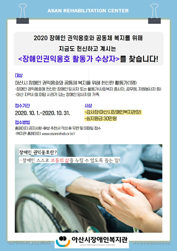 Çѱ¹ÁöüÀå¾ÖÀÎÇùȸ ¾Æ»ê½ÃÀå¾ÖÀκ¹Áö°ü(°üÀå ÀÌâȣ, ÀÌÇÏ ¾Æ»êÀ庹)Àº ¿À´Â 10¿ù 1ÀϺÎÅÍ 31ÀϱîÁö ¾Æ»êÁö¿ª ³» Àå¾ÖÀÎ ±ÇÀÍ¿ËÈ£ Ȱµ¿°¡¸¦ Áö¿øÇÏ°í ±× È°µ¿ÀÇ Àǹ̸¦ È®»êÇϰíÀÚ ¡®2020 ¾ÆÀ庹 Àå¾ÖÀαÇÀÍ¿ËȣȰµ¿°¡»ó¡¯ Èĺ¸ÀÚ¸¦ Á¢¼ö ¹Þ´Â´Ù.