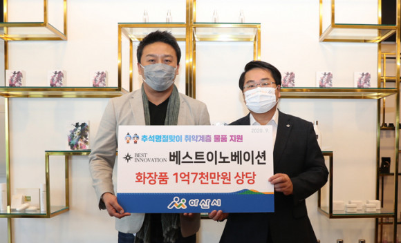 ¢ßº£½ºÆ®À̳뺣À̼Ç(´ëÇ¥ äÀ±¼®)ÀÌ °ü³» »çȸº¹Áö½Ã¼³ ¹× Ãë¾à°èÃþÀ» À§ÇØ 23ÀÏ ¾Æ»ê½Ã(½ÃÀå ¿À¼¼Çö)¿¡ 1¾ï7,000¸¸¿ø »ó´ç ÀÚü ºê·£µå ÈÀåǰÀ» Àü´ÞÇß´Ù.