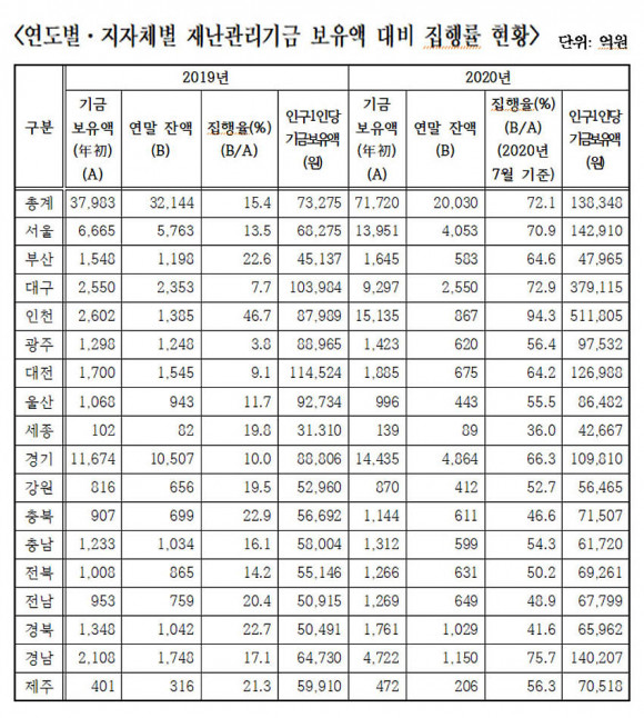 ÁöÀÚüº°·Î À糿¡ ´ëºñÇϴ ż¼ ¿ª½Ã õÂ÷¸¸º°ÀÎ °ÍÀ¸·Î ³ªÅ¸³µ´Ù. ÀÎõÀÇ °æ¿ì ±ä±ÞÀç³±â±Ý º¸À¯¾×À» 2019³â¿¡´Â 2õ602¾ï¿øÀ̾úÀ¸³ª 2020³â¿¡´Â 1Á¶ 5õ135¾ï¿øÀ¸·Î ±â±Ý ±Ô¸ð¸¦ 482%³ª Áõ¾×½ÃÄ×´Ù. ±×·³¿¡µµ 2020³â 7¿ù ±âÁØ ÁýÇàÀܾ×ÀÌ 867¾ï ¿ø¿¡ ºÒ°úÇÏ¿© ±â±Ý¼ÒÁøÀ²ÀÌ 94.3%³ª µÇ´Â °ÍÀ¸·Î ³ªÅ¸³µ´Ù.