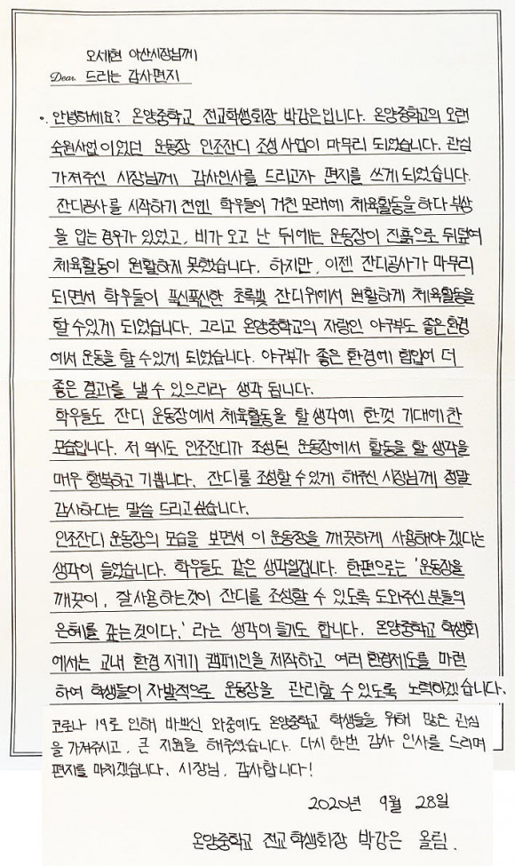 Áö³ 10¿ù 6ÀÏ ¾Æ»ê½ÃÀå½Ç·Î ÇÑÅëÀÇ ¼Õ ÆíÁö°¡ ¹è´ÞµÆ´Ù. ¿Â¾çÁßÇб³ Àü±³ÇлýȸÀåÀÌ º¸³»¿Â ÆíÁö¿´´Ù.