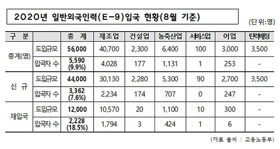 ±¹È¸ »ê¾÷Åë»óÀÚ¿øÁß¼Òº¥Ã³±â¾÷À§¿øÈ¸ °ÈÆ½Ä ÀÇ¿ø(´õºÒ¾î¹ÎÁÖ´ç, Ãæ³²¾Æ»êÀ»)ÀÌ °í¿ë³ëµ¿ºÎ·ÎºÎÅÍ Á¦Ãâ¹ÞÀº ±¹Á¤°¨»ç ÀÚ·á¿¡ µû¸£¸é, ¿ÃÇØ ÀϹݿܱ¹ÀηÂ(E-9) ÀÔ±¹ ¿¹Á¤ÀÚ´Â 5¸¸ 6õ¸íÀÌÁö¸¸, 8¿ù ±âÁØ ½ÇÁ¦ ÀÔ±¹Àº 5õ590¸í¿¡ ºÒ°úÇß´Ù.