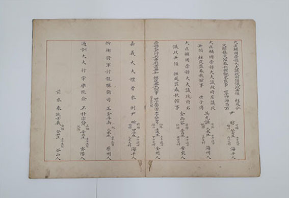 ´ç½Ã Âü¼®ÀÚ´Â ´ç½Ã ¿µÀÇÁ¤ À±¹æ(ëÅÛ²), ÁÂÀÇÁ¤ ¿ÀÀ±°â(çïëÃÌÇ), ¿ìÀÇÁ¤ ±è»ó¿ë(ÑÑ߯é»), º´Á¶ÆÇ¼ ÀÌÈ«ÁÖ(ì°ûðñ°), ¿¹Á¶ÂüÆÇ À±Èç(ëÅýÚ) µî 8¸íÀÌ Âü¿©Çß´Ù. µµÃ¸ÀÇ Èĸ鿡´Â 1635³â¿¡ Âü¼®ÀÚ ¿ìÀÇÁ¤ ±è»ó¿ëÀÇ µÑ° »çÀ§ÀÌÀÚ È¿Á¾ÀÇ ÀåÀÎÀÎ ÀåÀ¯(íåë«)°¡ ÁöÀº ¼¹®ÀÌ ÀÖ´Ù.
