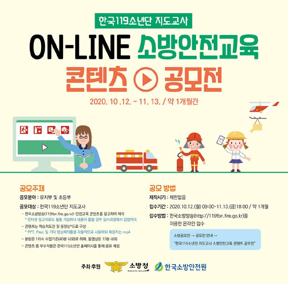 À̹ø °ø¸ðÀüÀº ¾î¸°À̵éÀÇ Á¶±â ¾ÈÀü¹®È Á¤ÂøÀ» À§ÇØ ¸ðÁýÇÑ Çѱ¹119¼Ò³â´ÜÀÇ È°µ¿ÀÌ Äڷγª19 °¨¿°º´ È®»ê¿¡ µû¶ó üÇèÇü ¼Ò¹æ¾ÈÀü±³À°ÀÌ °ï¶õÇØÁ® À§ÃàµÊ¿¡ µû¶ó À̸¦ °³¼±ÇϰíÀÚ ¸¶·ÃµÆ´Ù.
