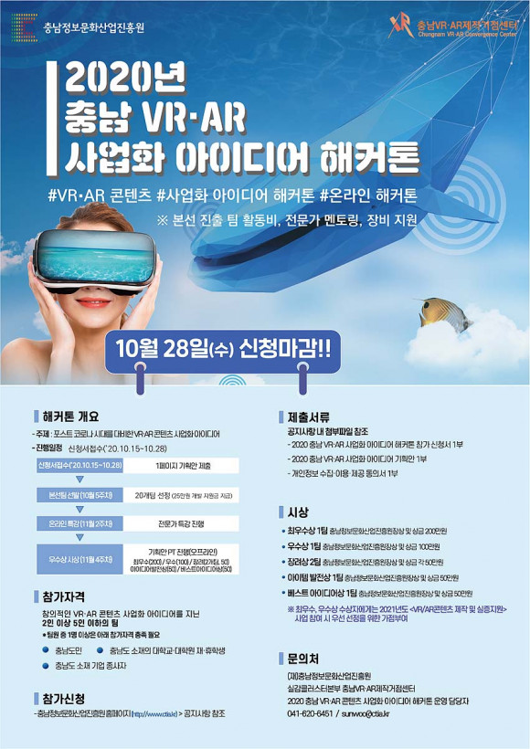 Á¢¼ö´Â ¿À´Â 28ÀϱîÁö ÁøÈï¿ø ȨÆäÀÌÁö(www.ctia.kr)¸¦ ÅëÇØ ÇÒ ¼ö ÀÖÀ¸¸ç, ÀÚ¼¼ÇÑ ³»¿ëÀº ÁøÈï¿ø VR¡¤ARÁ¦ÀÛ°ÅÁ¡¼¾ÅÍ(041-620-6451)·Î ¹®ÀÇÇÏ¸é µÈ´Ù.