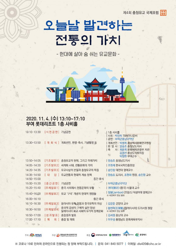 Á¦4ȸ ÃæÃ»À¯±³ ±¹Á¦Æ÷·³Àº ÀÏ¹Ý ±¹¹Î ´©±¸³ª Âü¿©ÇÒ ¼ö ÀÖÀ¸¸ç, Âü°¡ ¹®ÀÇ´Â Ãæ³²¿ª»ç¹®È¿¬±¸¿ø Çѱ¹À¯±³¹®ÈÁøÈï¿ø Áغñ´Ü(ÀüÈ 041-840-5075, ÀüÀÚ¿ìÆí sahyun@cihc.or.kr)À¸·Î ÇÏ¸é µÈ´Ù.