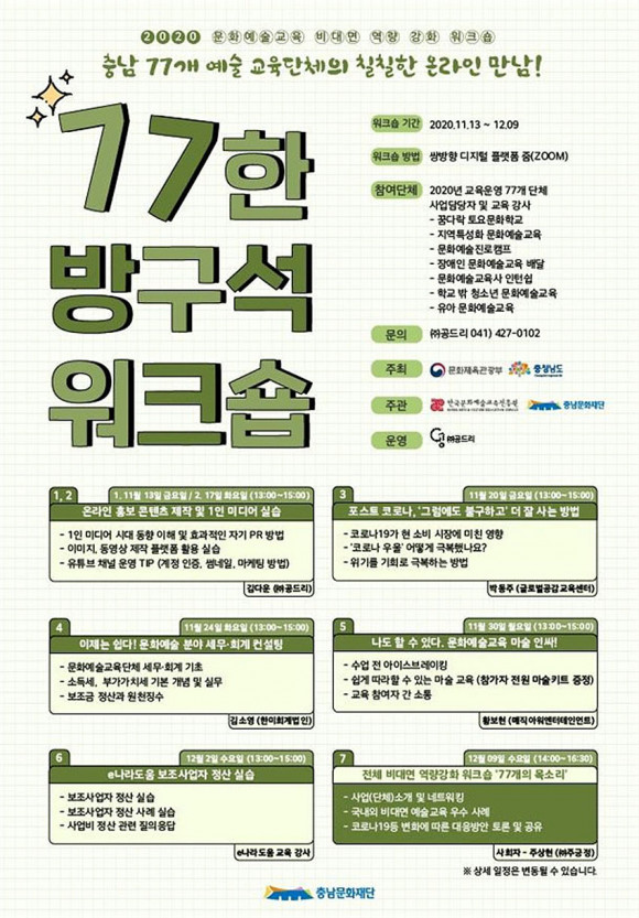¡®77ÇÑ ¹æ±¸¼® ¿öÅ©¼ó¡¯Àº Ãæ³²Áö¿ª¿¡¼ ¹®È¿¹¼ú±³À° »ç¾÷À» ¿î¿µ ÁßÀÎ 77°³ ´ÜüÀÇ Ä¥Ä¥ÇÑ(¼ºÁúÀ̳ª ÀÏ Ã³¸®°¡ ¹ÝµíÇÏ°í ¾ß¹«Áö´Ù) ¿Â¶óÀÎ ¸¸³²À¸·Î Äڷγª19 Àå±âÈ¿¡ µû¸¥ ¹®È¿¹¼ú±³À° °ø¹éÀ» ÃÖ¼ÒÈÇÏ°í ¾ÕÀ¸·ÎÀÇ ¹®È¿¹¼ú±³À°¿¡ ´ëÇØ ³íÀÇÇØº¸°íÀÚ °³ÃÖÇÏ°Ô µÆ´Ù.
