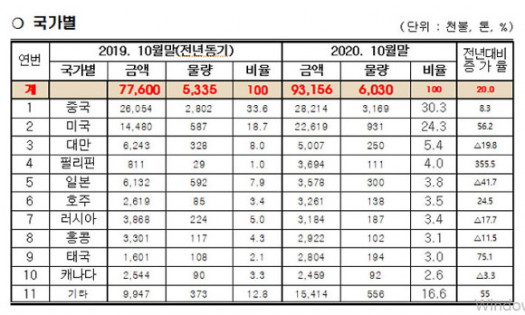 11¿ù 24ÀÏ µµ¿¡ µû¸£¸é, Áö³´Þ ¸» ±âÁØ µµ³» ¼ö»ê½Äǰ ¼öÃâ¾×Àº 9õ315¸¸ 6õ ´Þ·¯·Î Áý°èµÆ´Ù. ÀÌ´Â 9¿ù ¸» 8õ284¸¸ 4õ ´Þ·¯º¸´Ù 1õ31¸¸ 2õ ´Þ·¯(12.4%), Àü³â µ¿±â 7õ760¸¸ ´Þ·¯º¸´Ù 1õ555¸¸ 6õ ´Þ·¯(20%) Áõ°¡ÇÑ ±Ô¸ð´Ù.
