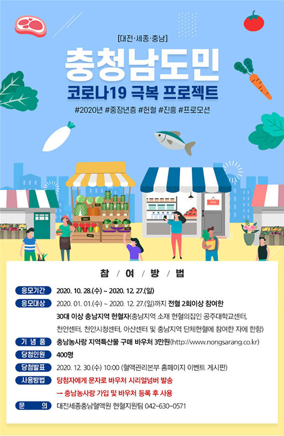 ±Ý³â 1¿ùºÎÅÍ 12¿ù±îÁö 2ȸ ÀÌ»ó Ãæ³²Áö¿ª¿¡¼ ÀüÇ÷ ÇåÇ÷¿¡ Âü¿©ÇÑ 30´ë ÀÌ»ó ÇåÇ÷ÀÚ¸¦ ´ë»óÀ¸·Î Ãæ³² ³ó»ç¶û Áö¿ª ³óƯ»ê¹° ±¸¸Å ¹Ù¿ìó 3¸¸¿ø »ó´çÀ» Áö±ÞÇÏ´Â À̹ø Àû½ÊÀÚÇ÷¾×¿øÀÇ À̺¥Æ®´Â Äڷγª19 »çŰ¡ Àå±âÈ µÇ´Â °¡¿îµ¥µµ »ý¸í³ª´® ÇåÇ÷¿îµ¿¿¡ Àû±ØÀûÀ¸·Î Âü¿©ÇÑ ÃæÃ»³²µµ 30´ë ÀÌ»ó ÇåÇ÷Àڵ鿡°Ô °¨»çÀÇ ¸Þ½ÃÁö¸¦ ÀüÇϱâ À§ÇØ ¸¶·ÃµÆ´Ù.