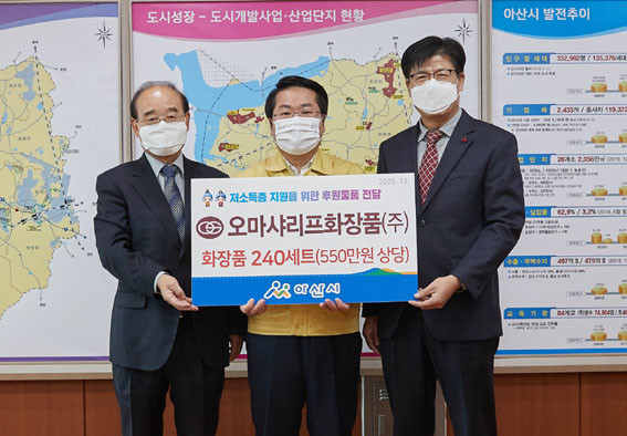 | | ¡è¡è ¡ã(¿ÞÂʺÎÅÍ) ±èµµ¿µ ´ëÇ¥ÀÌ»ç¿Í ¿À¼¼Çö ½ÃÀå, ¾Æ»ê½Ã±â¾÷ÀÎÇùÀÇȸ È«¿µÁØ »ç¹«±¹ÀåÀÌ ÈÄ¿ø¹°Ç° Àü´Þ½Ä ÈÄ ±â³ä ÃÔ¿µÀ» Çϰí ÀÖ´Ù. <»çÁøÁ¦°ø=¾Æ»ê½Ã> | ¨Ï ¿Â¾ç½Å¹® | | ¿À¸¶»þ¸®ÇÁÈÀåǰ(ÁÖ)(´ëÇ¥ÀÌ»ç ±èµµ¿µ)°¡ 12¿ù 3ÀÏ ¾Æ»ê½Ã(½ÃÀå ¿À¼¼Çö)¸¦ ¹æ¹®ÇØ Ãë¾à°èÃþ Áö¿øÀ» À§ÇÑ ÈÀåǰ 550¸¸ ¿ø »ó´ç 240¼¼Æ®¸¦ Àü´ÞÇß´Ù.