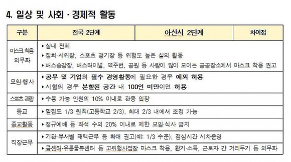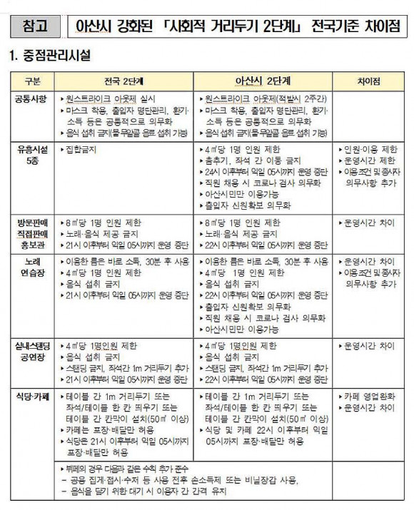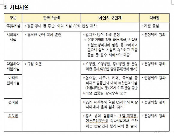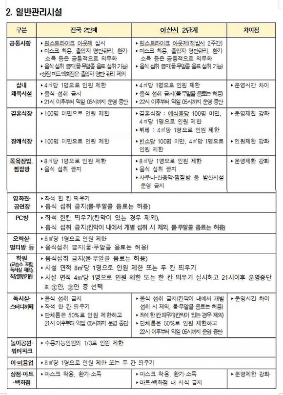 ÀÌ¾î¼ ¡ã¿©´ü°, °¨¿°Ãë¾à À§Çè½Ã¼³ÀÎ ¿ä¾ç¿ø, ¿ä¾çº´¿ø, Á¤½Åº´¿ø µîÀº ¿î¿µÁ¦ÇÑ À¯Áö, ¸éȸ ±ÝÁö µî ¿ÜºÎÀÎ ÃâÀÔÅëÁ¦, ¡ã¾ÆÈ©Â°, ÇコÀå, »ç¿ì³ª, µ¶¼½Ç µî ¾ÆÆÄÆ®¡¤°øµ¿´ÜÁö ³»ÀÇ º¹ÇÕÆíÀǽü³Àº ¿ÀÈÄ 10½Ã ÀÌÈÄ ¿î¿µ Áß´Ü, ¡ã¿ ¹øÂ°, ÆíÀÇÁ¡Àº 2¿ÀÈÄ 10½Ã ÀÌÈĺÎÅÍ ´ÙÀ½³¯ ¿ÀÀü 5½Ã±îÁö ¸ÅÀå ³»¿Ü¿¡¼ À½½Ä ¼·Ãë ±ÝÁöµÇ°í, °¢Á¾ ¸ðÀÓ ¹× Çà»ç´Â 100ÀÎ ¹Ì¸¸À¸·Î ÀοøÀÌ Á¦ÇѵǸç Á¾±³È°µ¿ÀÇ °æ¿ì Á¤±Ô¿¹¹è µî Á¼® ¼öÀÇ 20% À̳»·Î Á¦ÇÑµÇ¸ç ¸ðÀÓ°ú ½Ä»ç´Â ±ÝÁöµÇ¸ç, ±×¹Û¿¡ ¾ð±ÞÇÏÁö ¾ÊÀº ½Ã¼³¿¡ ´ëÇØ¼´Â Ãæ³²µµÀÇ »çȸÀû °Å¸®µÎ±â 2´Ü°è Á¶Ä¡ ³»¿ë¿¡ µû¶ó Àû¿ëµÈ´Ù.
