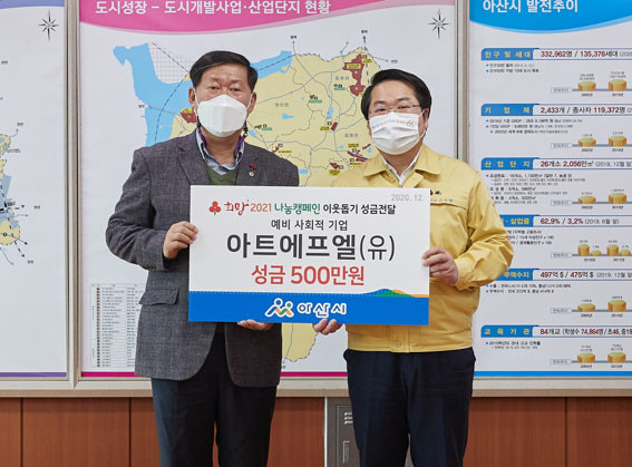 | | ¡è¡è ¡ã(¿ÞÂʺÎÅÍ) ÇѸí¼ö ´ëÇ¥¿Í ¿À¼¼Çö ½ÃÀåÀÌ ¼º±Ý Àü´Þ½Ä ÈÄ ±â³ä»çÁøÀ» Âï°í ÀÖ´Ù. <»çÁøÁ¦°ø=¾Æ»ê½Ã> | ¨Ï ¿Â¾ç½Å¹® | | ¾ÆÆ®¿¡ÇÁ¿¤(À¯)(´ëÇ¥ ÇѸí¼ö, ½Ç¿Áµ¿)°¡ 12¿ù 11ÀÏ ¾Æ»ê½Ã(½ÃÀå ¿À¼¼Çö)¸¦ ¹æ¹®ÇØ Èñ¸Á 2021 ³ª´® Ä·ÆäÀÎ ¼º±Ý 500¸¸ ¿øÀ» ±âºÎÇß´Ù.