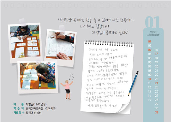 Æò»ýÇнÀ°ü¿¡¼´Â µÚ´Ê°Ô ÇѱÛÀ» ¹è¿ì´Â ÀúÇз ºñ¹®ÇØ(ÞªÙþú°) ¾î¸£½ÅµéÀ» À§ÇÑ ¹®Çر³À°À» ½Ç½ÃÇß°í, Âü¿©ÀÚµéÀÇ ¹è¿ò¿¡ ´ëÇÑ ¿Á¤À» ´ã¾Æ 2021³â Ź»ó´Þ·ÂÀ» Á¦ÀÛÇÏ°Ô µÆ´Ù.