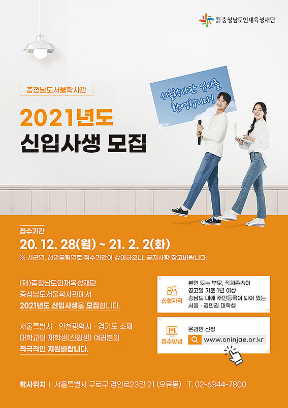 ÃæÃ»³²µµ Ãâ½Å ¼öµµ±Ç¼ÒÀç(¼¿ï¡¤ÀÎõ¡¤°æ±â) ´ëÇлýÀÇ °ÅÁÖºñ ºÎ´ã ÇØ¼Ò¿Í ÄèÀûÇÑ ¸éÇРȯ°æ Á¦°øÀ» À§ÇØ Áö³ 8¿ù¿¡ °³°üÇÑ Ãæ³²¼¿ïÇлç°üÀÌ 21³âµµ ½ÅÀÔ»ç»ýÀ» ¸ðÁý¡¤¼±¹ßÇÑ´Ù.