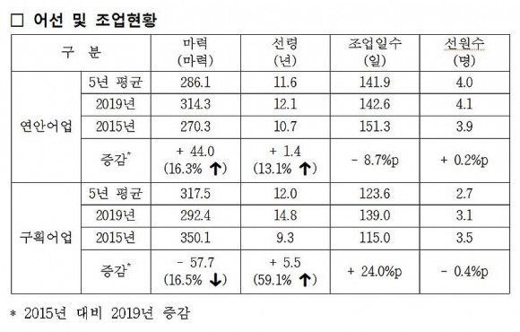 2015³â ´ëºñ 2019³â ¿¬¾È¾î¾÷ ÇöȲÀ» º¸¸é, ¾î¼±ÀÇ ¸¶·Â(270.3¸¶·Â¡æ314.3¸¶·Â)°ú ¼±·É(10.7³â¡æ12.1³â), ¼±¿ø ¼ö(3.9¸í¡æ4.1¸í)°¡ Áõ°¡Çß°í Á¶¾÷ÀÏ ¼ö(151.3ÀÏ¡æ142.6ÀÏ)´Â °¨¼ÒÇß´Ù.