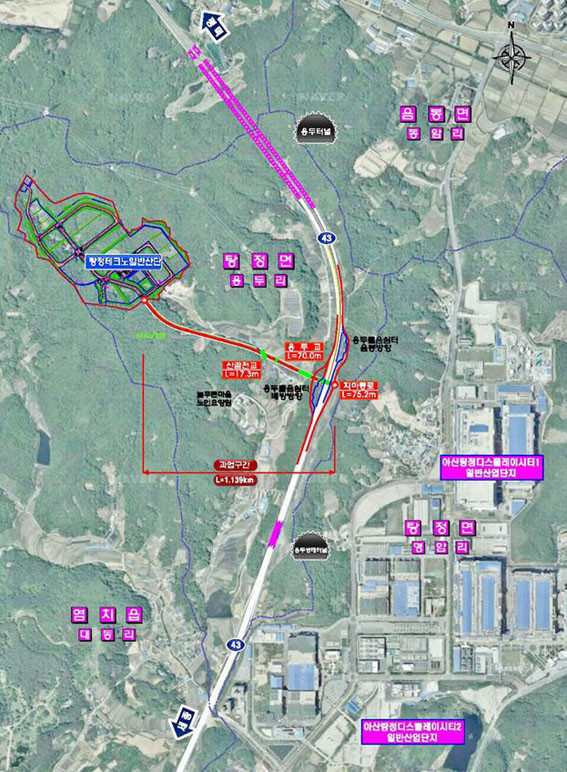 ÁøÀÔµµ·Î °ø»ç¸¦ ÅëÇØ ¿¹»ê±¹Åä°ü¸®»ç¹«¼Ò¿¡¼ ¼³Ä¡¿¹Á¤ÀÎ ±¹µµ43È£¼± Á¹À½½°ÅÍ¿Í ¿¬°èÇØ ½Å±Ô ÀÔü±³Â÷·Î¸¦ ¼³Ä¡Çϰí, ÅÁÁ¤Å×Å©³ë ÀϹݻê¾÷´ÜÁö¿Í ¿¬°áÇÏ´Â ½Å±Ô±³·®(70m)°ú »ê°ñõ±³(17m) 2°³ ±³·®À» ½Å¼³ÇÒ ¿¹Á¤ÀÌ´Ù.