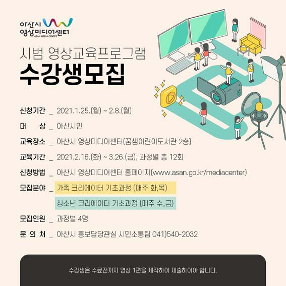 ¾Æ»ê½Ã ¿µ»ó¹Ìµð¾î¼¾ÅÍ ¿µ»óÁ¦ÀÛ±³À°ÇÁ·Î±×·¥¿¡ ´ëÇÑ ÀÚ¼¼ÇÑ ³»¿ëÀº ¾Æ»ê½Ã ¿µ»ó¹Ìµð¾î¼¾ÅÍ È¨ÆäÀÌÁö(asan.go.kr/mediacenter)¿¡¼ È®ÀÎÇÒ ¼ö ÀÖÀ¸¸ç, ±âŸ »çÇ×Àº Àüȹ®ÀÇ(041-540-2032)¸¦ ÅëÇØ È®ÀÎÇÒ ¼ö ÀÖ´Ù.