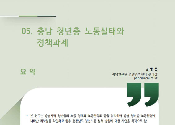 ÃÖ±Ù Ãæ³²¿¬±¸¿ø(¿øÀå À±È²) Àαǰ濵¼¾ÅÍ ±èº´ÁØ ¼¾ÅÍÀåÀº ¡®Ãæ³² »çȸÁ¶»ç¸¦ Ȱ¿ëÇÑ 2020 µµ¹ÎÀÇ »î°ú Á¤Ã¥ ¿¬±¸¡¯ÀÇ ÀÏȯÀ¸·Î µµ³» °ÅÁÖÇϴ û³âµéÀÇ ³ëµ¿ÇüÅÂ¿Í ³ëµ¿¸¸Á·µµ µîÀ» ºÐ¼®ÇØ ¡®Ãæ³² û³âÃþ ³ëµ¿½ÇÅÂ¿Í Á¤Ã¥°úÁ¦ ¿¬±¸¡¯¸¦ ¼öÇàÇß´Ù.
