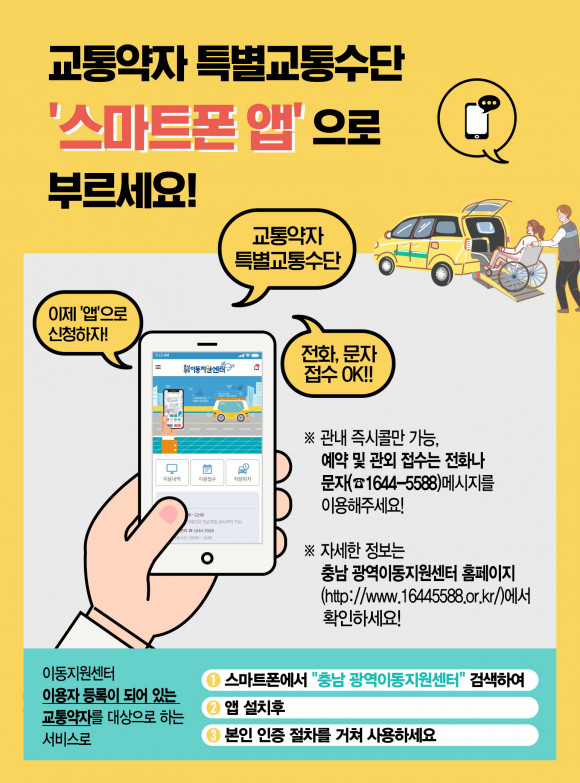 ½º¸¶Æ®Æù ¹èÂ÷ ¾ÛÀ» ÀÌ¿ëÇϱâ À§Çؼ´Â »çÀü¿¡ Ưº°±³Åë¼ö´Ü ÀÌ¿ë´ë»óÀÚ·Î µî·ÏµÅ ÀÖ¾î¾ß Çϸç, ½º¸¶Æ®Æù¿¡¼ ¡®ÃæÃ»³²µµ ±¤¿ª À̵¿ Áö¿ø¼¾ÅÍ ÀÌ¿ëÀÚ¡¯¸¦ °Ë»öÇÑ µÚ º»ÀÎÀÎÁõ ÀýÂ÷¸¦ °ÅÄ¡¸é µÈ´Ù. ¾ÛÀ» ÅëÇØ¼´Â °ü³» Áï½Ã Äݸ¸ °¡´ÉÇϸç, ¿¹¾à ¹× °ü¿ÜÁ¢¼ö´Â »ó´ã¿ø ÀüÈ¿Í ¹®ÀÚ¸Þ½ÃÁö ½Åû¸¸ °¡´ÉÇÏ´Ù.