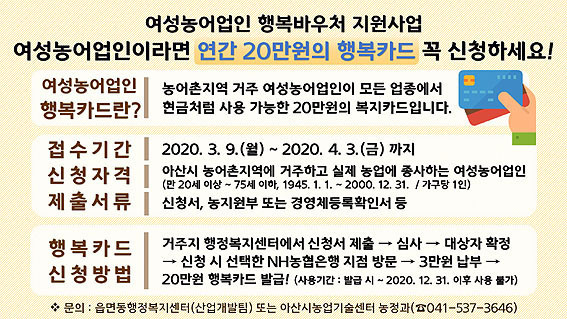 Çູ¹Ù¿ìó Áö¿ø»ç¾÷Àº ¾Æ»ê½Ã ³ó¾îÃÌÁö¿ª¿¡ °ÅÁÖÇϰí, ½ÇÁ¦ ¿µ³ó¿¡ Á¾»çÇÏ´Â ¸¸ 20¼¼ ÀÌ»ó~¸¸ 75¼¼ ÀÌÇÏÀÇ ¿©¼º³ó¾î¾÷Àο¡°Ô ¸ðµç ¾÷Á¾¿¡¼ Çö±Ýó·³ »ç¿ëÇÒ ¼ö ÀÖ´Â 20¸¸¿øÀÇ º¹ÁöÄ«µå¸¦ Áö¿øÇÑ´Ù.