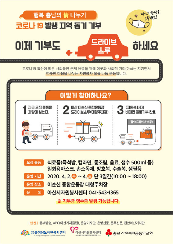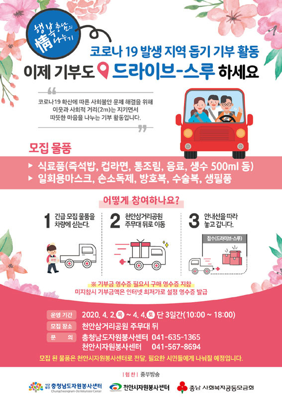 ÃæÃ»³²µµÀÚ¿øºÀ»ç¼¾ÅÍ(¼¾ÅÍÀå ¹Ú¼º¼ø), õ¾È½ÃÀÚ¿øºÀ»ç¼¾ÅÍ(¼¾ÅÍÀå ±è¿ë¼®), ¾Æ»ê½ÃÀÚ¿øºÀ»ç¼¾ÅÍ(¼¾ÅÍÀå ±è´ë°æ)´Â Äڷγª19 ¹ß»ý Áö¿ª¹ÎÀ» µ½±â À§ÇØ 4¿ù 2ÀϺÎÅÍ 4ÀϱîÁö õ¾È»ï°Å¸® °ø¿ø ÁÖÂ÷Àå°ú ¾Æ»êÀ̼ø½ÅÁ¾ÇտÀå ´ëÇüÁÖÂ÷Àå¿¡¼ ¡®Çູ Ãæ³²ÀÇ Á¤ ³ª´©±â ±âºÎ¹°Ç° ¸ðÁý Ä·ÆäÀΡ¯À» Àü°³ÇÑ´Ù°í ¹àÇû´Ù.