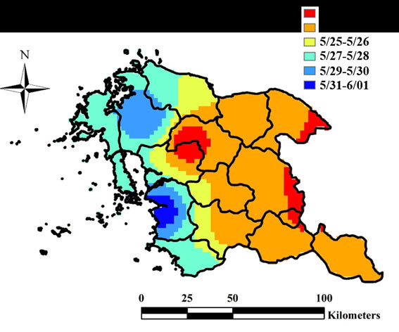 µµ ³ó¾÷±â¼ú¿øÀº °¥»ö³¯°³¸Å¹ÌÃæÀÇ ¿ùµ¿¾Ë Á¶»ç¸¦ ¹ÙÅÁÀ¸·Î ½Ã¡¤±ºº° ¹ß»ý·®°ú ºÎÈ ½Ã±â¸¦ ºÐ¼®ÇÑ °á°ú, ´Ù¹ß»ý Áö¿ªÀ¸·Î ±Ý»ê¡¤°øÁÖ¡¤Ã»¾ç¡¤¼Ãµ¡¤º¸·É¡¤¿¹»ê¡¤È«¼ºÀ» ²Å¾Ò´Ù. ¹Ý¸é ¼»ê¡¤ÅÂ¾È Áö¿ªÀº »ó´ëÀûÀ¸·Î ¹ß»ýÀÌ ÀûÀ» °ÍÀ» ¿¹ÃøÇß´Ù.