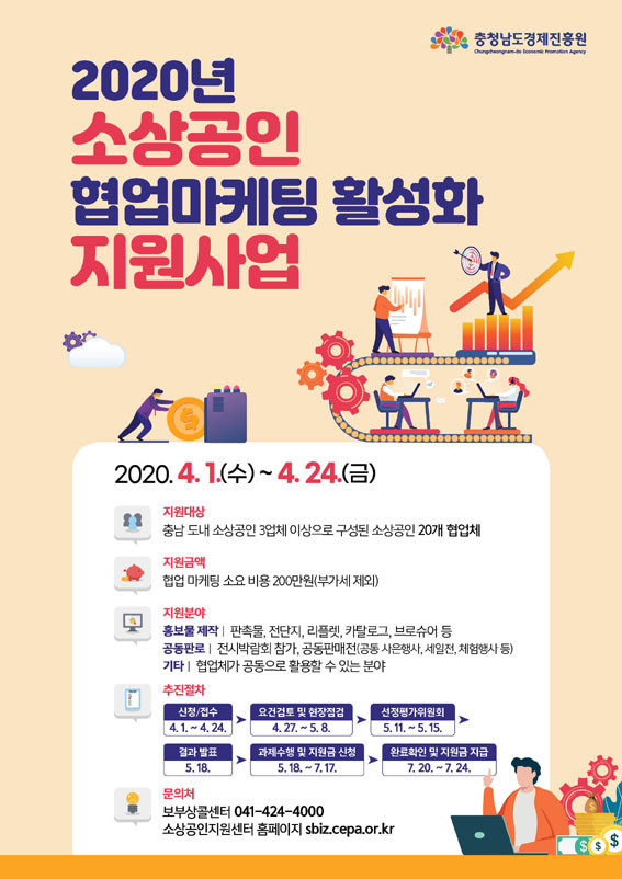 Áö¿ø»ç¾÷°ú °ü·ÃÇØ º¸´Ù ÀÚ¼¼ÇÑ ³»¿ëÀº Ãæ³² º¸ºÎ»óÄݼ¾ÅÍ(041-424-4000)¿Í Ãæ³² ¼Ò»ó°øÀÎÁö¿ø¼¾ÅÍ È¨ÆäÀÌÁö(www.sbiz.cepa.or.kr)¸¦ ÅëÇØ È®ÀÎÇÒ ¼ö ÀÖ´Ù.