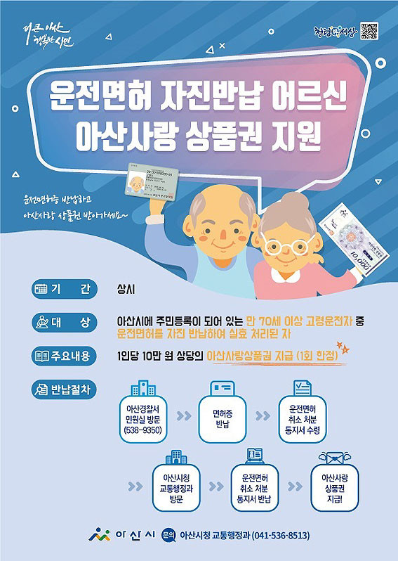 ¾Æ»ê½Ã(½ÃÀå ¿À¼¼Çö)´Â ¸¸ 70¼¼ ÀÌ»ó °í·É ¿îÀüÀÚ°¡ ¿îÀü¸éÇãÁõÀ» ÀÚÁø¹Ý³³ÇÏ¸é ¾Æ»ê»ç¶û»óǰ±Ç 10¸¸ ¿øÀ» Áö±ÞÇÑ´Ù.