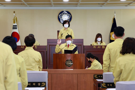 À̳¯ 1Â÷ º»È¸ÀÇ ÀÇ»çÀÏÁ¤ Àü Áö³ 4¡¤15 ¾Æ»ê½ÃÀÇȸ ÀÇ¿ø Àç¼±°Å¸¦ ÅëÇØ ¹ÎÀÇÀÇ Àü´ç¿¡ ÀÔ¼ºÇÑ À±¿øÁØ ÀÇ¿øÀº ¼±¼¸¦ ÅëÇØ ¡°¹ý·ÉÁؼö¿Í ÁÖ¹ÎÀÇ ±ÇÀͽÅÀå°ú º¹¸®ÁõÁø ¹× Áö¿ª»çȸ¹ßÀüÀ» À§ÇÏ¿© ÀÇ¿øÀÇ Á÷¹«¸¦ ¾ç½É¿¡ µû¶ó ¼º½ÇÈ÷ ¼öÇàÇϰڴ١±¸ç º»È¸ÀÇÀå¿¡¼ ¾ö¼÷È÷ ¼±¼Çß´Ù.