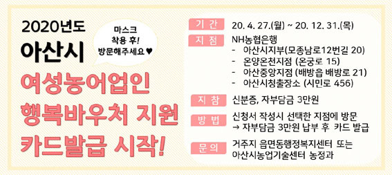 ¾Æ»ê½Ã(½ÃÀå ¿À¼¼Çö)°¡ ¿©¼º³ó¾î¾÷ÀÎ Çູ¹Ù¿ìó Áö¿ø»ç¾÷ 1Â÷ ´ë»óÀÚ 4048¸íÀ» È®Á¤Çϰí 4¿ù 27ÀϺÎÅÍ 5¿ù 29ÀϱîÁö Ä«µå¹ß±Þ¿¡ µ¹ÀÔÇß´Ù.