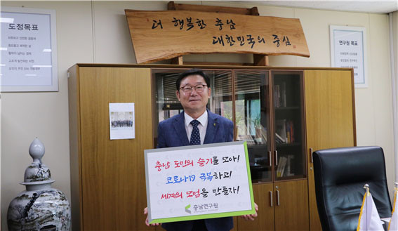 Çѱ¹Áö¹æÇàÁ¤¿¬±¸¿ø À±Å¹ü ¿øÀåÀÇ Áö¸ñÀ» ¹ÞÀº À±È² ¿øÀåÀº ¡®Ãæ³² µµ¹ÎÀÇ ½½±â¸¦ ¸ð¾Æ! Äڷγª19 ±Øº¹Çϰí! ¼¼°èÀÇ ¸ð¹üÀ» ¸¸µéÀÚ!¡¯¶ó´Â ¸Þ½ÃÁö¸¦ ÀüÇÏ¸ç ´ÙÀ½ Âü¿©ÀÚ·Î ¼¿ï ÇÑ¿µ´ëÇб³ ÇÑ¿µÈÆ ÃÑÀåÀ» Áö¸íÇß´Ù.