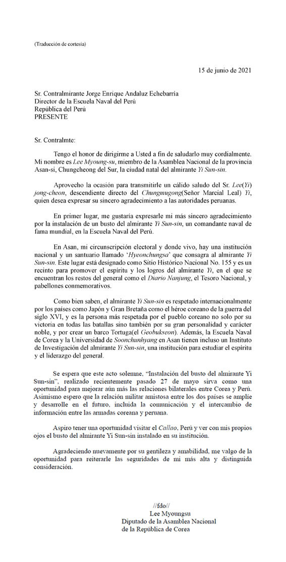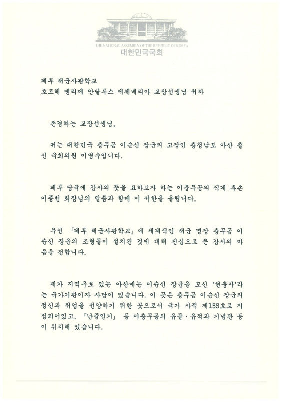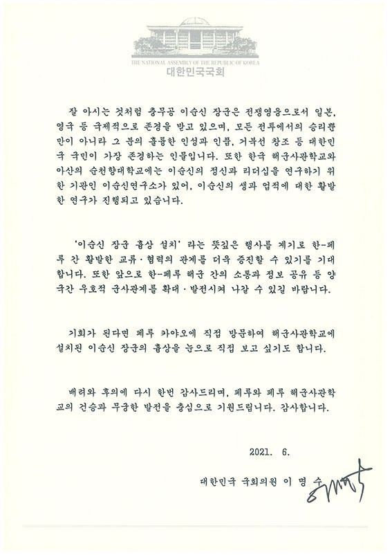 À̸í¼ö ÀÇ¿øÀº ¡°Ã湫°ø À̼ø½Å À屺ÀÇ °íÀåÀÎ ÃæÃ»³²µµ ¾Æ»ê Ãâ½Å ±¹È¸ÀÇ¿øÀ¸·Î¼ ±â»Û¸¶À½°ú ÇÔ²² Æä·ç¿¡ Áø½ÉÀ¸·Î °¨»çÇÑ ¸¶À½À» °®°í ÀÖ´Ù¡±¸ç, ¡°´ëÇѹα¹ ±¹¹ÎÀÌ °¡Àå Á¸°æÇÏ´Â ¿µ¿õÀÎ À̼ø½Å À屺Àº ÀϺ», ¿µ±¹ µî ±¹Á¦ÀûÀ¸·Îµµ Á¸°æÀ» ¹Þ°í ÀÖ´Â Àι° Áß ÇÑ ºÐÀÌ´Ù. À̹ø À̼ø½Å À屺ÀÇ Èä»ó Á¦¸·Àº ÇÑ-Æä·ç °£ ±¹¹æ ¹× ±º»ç °ü°è¸¦ È®´ë¡¤¹ßÀü½ÃÄÑ ³ª°¥ ¼ö ÀÖ´Â °è±â°¡ µÉ °Í¡±À̶ó°í Àǹ̸¦ °Á¶Çß´Ù.