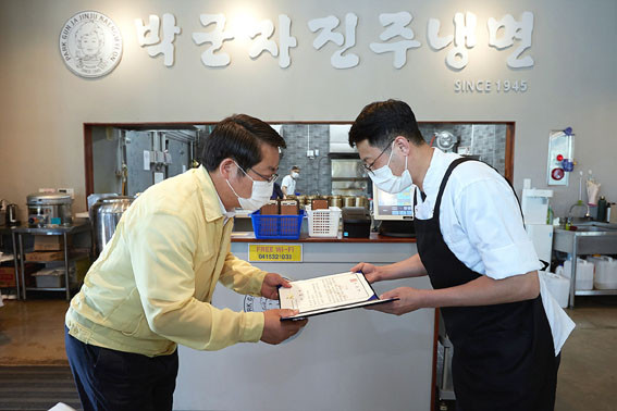 | | ¡è¡è ¡ã¿À¼¼Çö ½ÃÀåÀÌ ¡®½¡Ç⡯¿¡¼ Ãæ³²Çü THE ¾È½É½Ä´ç ÁöÁ¤ ½ºÆ¼Ä¿¸¦ ºÎÂøÇϰí ÀÖ´Ù. <»çÁøÁ¦°ø=¾Æ»ê½Ã> | ¨Ï ¿Â¾ç½Å¹® | | ¿À¼¼Çö ¾Æ»ê½ÃÀåÀÌ 6¿ù 21ÀÏ ¡®Ãæ³²Çü THE ¾È½É½Ä´ç¡¯À¸·Î ÁöÁ¤µÈ À½½ÄÁ¡ Áß ½¡Çâ°ú ¹Ú±ºÀÚÁøÁֳøéÀ» Â÷·Ê·Î ÇöÀåÀ» ¹æ¹®Çϰí ÁöÁ¤ÁõÀ» Àü´ÞÇß´Ù.