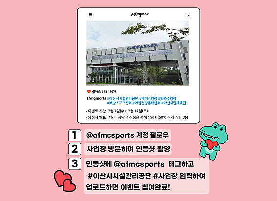 À̺¥Æ® Âü¿©¹æ¹ýÀº üÀ°½Ã¼³ ÀνºÅ¸±×·¥ °èÁ¤(@afmcsports)À» ÆÈ·Î¿ì ÇÑ ÈÄ, üÀ°½Ã¼³(¹è¹Ì¡¤¹æÃà¼ö¿µÀå, ¹è¹æ½ºÆ÷Ã÷¼¾ÅÍ, °Ç°¹®È¼¾ÅÍ, ½Ã¹ÎüÀ°°ü)ÀÇ ¹æ¹® ÀÎÁõ¼¦À» Âï¾î #¾Æ»ê½Ã½Ã¼³°ü¸®°ø´Ü #¹æ¹®½Ã¼³¸í(¹è¹Ì¼ö¿µÀå ¹æ¹® ½Ã #¹è¹Ì¼ö¿µÀå) ÇØ½ÃÅÂ±×¿Í ÇÔ²² @afmcsports¸¦ ű×ÇØ ¾÷·ÎµåÇÏ¸é µÈ´Ù.