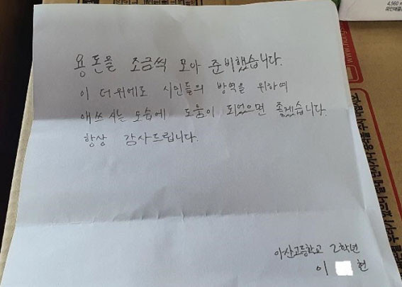 Áö³ 7¿ù 11ÀÏ ¾Æ»ê½Ã º¸°Ç¼Ò¿¡ ¡®¿ëµ·À» Á¶±Ý¾¿ ¸ð¾Æ ÁغñÇß½À´Ï´Ù. Ç×»ó °¨»çÇÕ´Ï´Ù¡¯¶ó´Â ¸Þ½ÃÁö¿Í ÇÔ²² ÀÀ¿ø ¹°Ç°ÀÌ µµÂøÇß´Ù. ¹ß½ÅÀÎÀº ¾Æ»ê°íµîÇб³ 2Çгâ ÇлýÀ¸·Î ¡®Æø¿° ¼Ó ¹æ¿ª ÇöÀå¿¡¼ ¾Ö¾²´Â ºÐµé²² µµ¿òÀÌ µÇ±æ ¹Ù¶õ´Ù¡¯´Â ÀÀ¿ø°ú ÇÔ²²¿´´Ù.