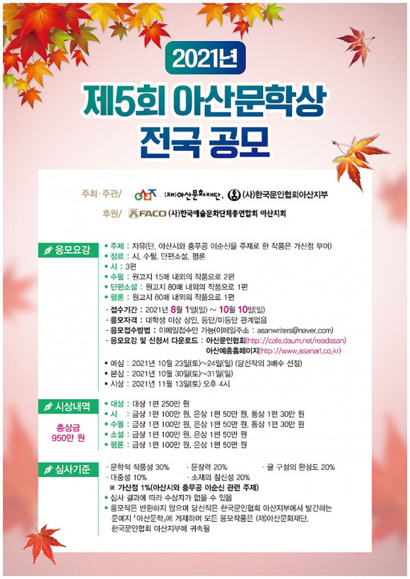 (Àç)¾Æ»ê¹®ÈÀç´Ü°ú (»ç)Çѱ¹¹®ÀÎÇùȸ ¾Æ»êÁöºÎ°¡ ÁÖÃÖ¡¤ÁÖ°üÇϰí, (»ç)Çѱ¹¹®È¿¹¼ú´ÜüÃÑ¿¬ÇÕȸ ¾Æ»êÁöȸ°¡ ÈÄ¿øÇÏ´Â ÃÑ »ó±Ý 910¸¸ ¿ø ±Ô¸ðÀÇ Á¦5ȸ ¡®¾Æ»ê¹®Çлó Àü±¹ °ø¸ð¡¯°¡ ¿À´Â 8¿ù 1ÀϺÎÅÍ 10¿ù 10ÀÏ ÀÚÁ¤±îÁö Âü°¡ ÀÛǰÀ» ¸ðÁýÇÑ´Ù.