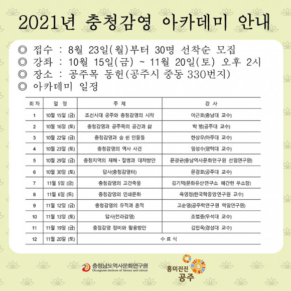 ¡®ÃæÃ»°¨¿µ ¾ÆÄ«µ¥¹Ì¡¯°Á´ Á¶¼±½Ã´ë ÃæÃ»°¨¿µÀÇ ½ÃÀÛ¿¡¼ºÎÅÍ °¨¿µ°ú °ü°èµÈ Àι°°ú »ç°Ç, °Ç¹°, ³²¾ÆÀÖ´Â À¯Àû°ú ÈçÀû µîÀ» ÁÖÁ¦·Î ´Ù¾çÇÑ ºÐ¾ßÀÇ Àü¹®°¡¸¦ ÃʺùÇÏ¿© ÀϹÝÀÎ ´«³ôÀÌ¿¡ ¸ÂÃç ½±°Ô ÁøÇàµÉ ¿¹Á¤ÀÌ´Ù.