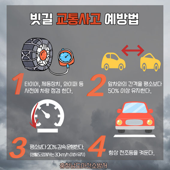 ºø±æ ¾ÈÀü»ç°í ¿¹¹æ¿ä·ÉÀ¸·Î´Â ¡ãŸÀ̾î, Á¦µ¿ÀåÄ¡, ¿ÍÀÌÆÛ µî »çÀü¿¡ Â÷·®À» Á¡°Ë ¡ã¾ÕÂ÷¿ÍÀÇ °£°ÝÀ» Æò¼Òº¸´Ù 50% ÀÌ»ó À¯Áö ¡ãÆò¼Òº¸´Ù 20% °¨¼Ó ¿îÇà(»ýȰµµ·Î¿¡¼´Â 30km/h ÀÌÇÏ À¯Áö) ¡ãÇ×»ó ÀüÁ¶µîÀ» ÄÑ´Â µîÀÇ ¾ÈÀüÁ¶Ä¡¸¦ ÇØ¾ß ÇÑ´Ù.