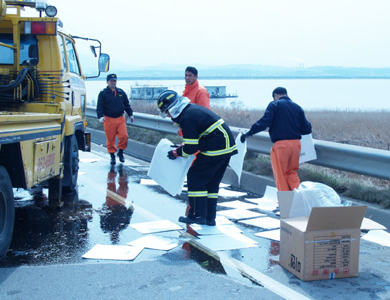 À̹ø Àüº¹ »ç°í·Î Â÷·®¿¡ ÀûÀçµÇ¾î ÀÖ´ø µîÀ¯ Áß ¾à100L(¸®ÅÍ)°¡ µµ·Î·Î À¯ÃâµÅ ±ä±Þ Ã⵿ÇÑ ¾Æ»ê¼Ò¹æ¼­ °ü°èÀÚµéÀÌ ÈíÂøÆ÷ ¹× ¸ð·¡ µîÀ¸·Î Á¦°ÅÀÛ¾÷À» °¡Á³´Ù.