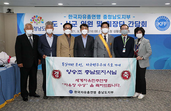 ¾ç Áö»ç´Â 9¿ù 27ÀÏ µµÃ» Á¢°ß½Ç¿¡¼ ±è»óÇÑ Çѱ¹ÀÚÀ¯ÃÑ¿¬¸Í Ãæ³²µµÁöºÎ ȸÀåÀ» ¸¸³ª ¼¼°èÀÚÀ¯¹ÎÁÖ¿¬¸ÍÀÌ ¼ö¿©ÇÏ´Â ±¹Á¦ÀÚÀ¯ÀåÀ» Àü´Þ¹Þ¾Ò´Ù.