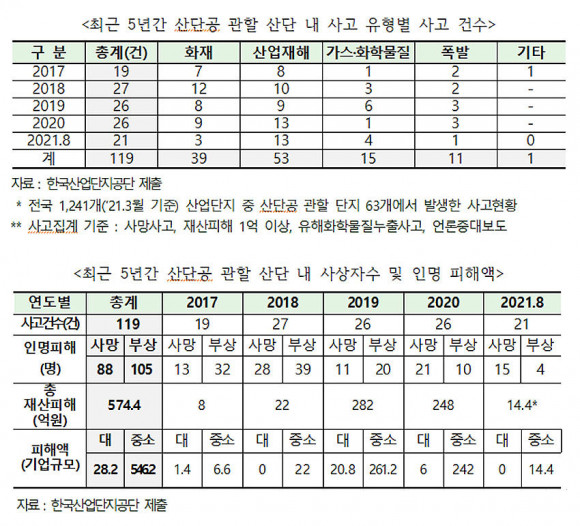»ê´Ü°ø °üÇÒ »ê¾÷´ÜÁö³» »ç°í´Â ÃÖ±Ù 5³â°£ ÃÑ 119°ÇÀ¸·Î, ÈÀç 39°Ç, »ê¾÷ÀçÇØ 53°Ç, À¯Çع°Áú ´©Ãâ 15°Ç, Æø¹ß»ç°í 11°ÇÀ¸·Î ³ªÅ¸³µ´Ù. ¸Å³â Æò±Õ 18¸íÀÌ »ç¸ÁÇϰí, 20¸íÀÌ ³Ñ°Ô ºÎ»óÀ» ´çÇß´Ù.