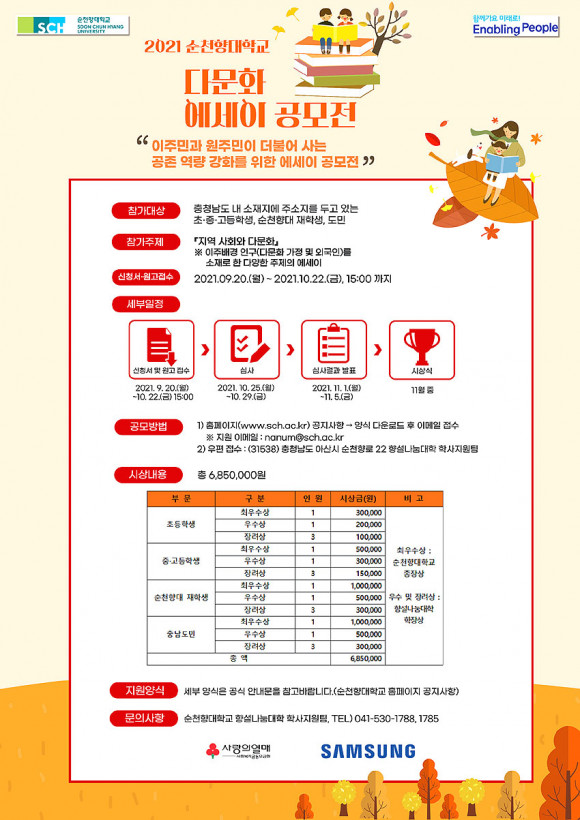 ÇÑÆí, º» °æÁø´ëȸ´Â »çȸº¹Áö°øµ¿¸ð±Ýȸ¿Í »ï¼ºÀÇ ÈÄ¿øÀ» ¹Þ¾Æ 2019³âºÎÅÍ ÃßÁøÇÏ´Â ¡®´Ù¹®È °øÁ¸(´õºÒ¾î »î) ¿ª·® °³¹ßÀ» À§ÇÑ ´ëÇÐ ±â¹Ý Áö¿ø ü°è ±¸Ãà»ç¾÷¡¯ Áß Çϳª´Ù. ½Åû¼ ¹× ¿ø°í´Â À̸ÞÀÏ(nanum@sch.ac.kr) ¶Ç´Â ¿ìÆí(31538, ÃæÃ»³²µµ ¾Æ»ê½Ã ¼øÃµÇâ·Î 22 Çâ¼³³ª´®´ëÇÐ ÇлçÁö¿øÆÀ)À¸·Î Á¢¼öÇÒ ¼ö ÀÖ´Ù.