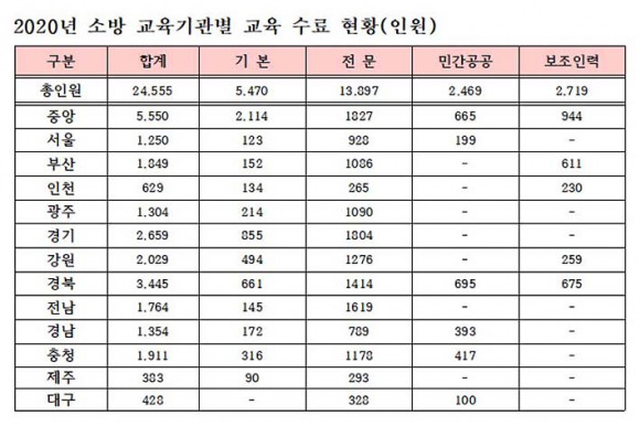 ¼Ò¹æÃ»¿¡¼ À̸í¼ö ÀÇ¿ø½Ç¿¡ Á¦ÃâÇÑ ÀÚ·á¿¡ µû¸£¸é, 2020³â Áß¾Ó ¹× Áö¹æ¼Ò¹æÇб³ÀÇ ±³À° ¼ö·á ÀοøÀº ÃÑ 2¸¸ 4õ555¸íÀ¸·Î ±âº»±³À° 5õ470¸í, Àü¹®±³À° 1¸¸ 3õ897¸í, ¹Î°£°ø°ø±³À° 2õ469¸í, º¸Á¶Àη±³À° 2õ719¸íÀ¸·Î ³ªÅ¸³µ´Ù.