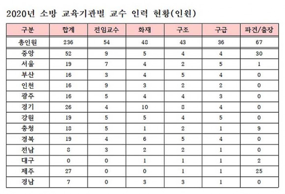 À̸í¼ö ÀÇ¿øÀº ¡°±³¼ö 1ÀÎ´ç Æò±Õ 101¸íÀ» ´ã´çÇϰí ÀÖ´Â ¼ÀÀε¥, ¡¸¼Ò¹æ±³À°ÈƷñâ°ü ½Ã¼³¡¤Àη ¹× Àåºñ µî ¼³Ä¡¿î¿µ ±âÁØ(ÈÆ·É)¡¹Á¦9Á¶¿¡ µû¶ó ÈÀç ¹× ±¸Á¶ÈƷýÿ¡´Â ±³À°»ý 5¸í´ç 1¸í(±¸±ÞÀº 10¸í ´ç 1¸í)ÀÇ ±³°üÀ» ¹èÄ¡ÇÏ°Ô µÇ¾î ÀÖÁö¸¸, ÇöÀç ±³¼ö ¿ä¿øÀÌ ÅξøÀÌ ºÎÁ·ÇÑ »óȲ¡±¸®¶ó°í ¹àÈ÷¸ç, ¡°Á¦ÁÖ¼Ò¹æÇб³´Â ±³¼ö Àüü 27¸í Áß 25¸íÀÌ ÆÄ°ß/ÃâÀåÀηÂÀ̰í Áß¾Ó¼Ò¹æÇб³ ¿ª½Ã 52¸í Áß 30¸íÀ¸·Î ÆÄ°ß/ÃâÀåÀηÂÀÌ ¸¹À¸¸ç, ´ë±¸.°æ³².Á¦ÁÖ¼Ò¹æÇб³¿¡´Â ÀüÀÓ±³¼öÁ¶Â÷ ¾ø´Ù¡±°í ÁöÀûÇß´Ù.