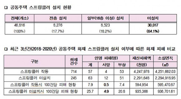 ÀÌ¿¡ À̸í¼ö ÀÇ¿øÀº ¡°½ºÇÁ¸µÅ¬·¯ ¼³Ä¡ ¿©ºÎ¿¡ µû¶ó ÀθíÇÇÇØ ¹× Àç»êÇÇÇØ Á¤µµ°¡ Çö°ÝÇÑ Â÷À̸¦ º¸ÀÌ´Â °ÍÀº ½ºÇÁ¸µÅ¬·¯·Î ÀÎÇÑ Ãʱâ ÈÀçÁø¾ÐÀÌ °¡´ÉÇÏ°í ¿¬±âÈíÀÔÀ¸·Î ÀÎÇÑ Áú½Ä»ç ¿¹¹æ È¿°ú°¡ Àֱ⠶§¹®ÀÌ´Ù¡±¶ó¸ç, ¡°ÇöÇà¹ý»ó ½ºÇÁ¸µÅ¬·¯ Àǹ«È°¡ ¿Ï·áµÇ¾úÁö¸¸ À̸¦ ¼Ò±ÞÀû¿ëÇÏÁö ¾Ê±â ¶§¹®¿¡ ÈÀç¿¡ Ãë¾àÇÑ ³ëÈÄ ¾ÆÆÄÆ®¿¡ ´ëÇÑ ¼Ò¹æÃ» Â÷¿øÀÇ ´ëÃ¥ ¸¶·Ã°ú Àü±¹ ½ºÇÁ¸µÅ¬·¯ ¹Ì¼³Ä¡ °øµ¿ÁÖÅà Àüü·ÎÀÇ ¼³Ä¡ È®´ë°¡ ÇÊ¿äÇÏ´Ù¡±°í ÁöÀûÇß´Ù.
