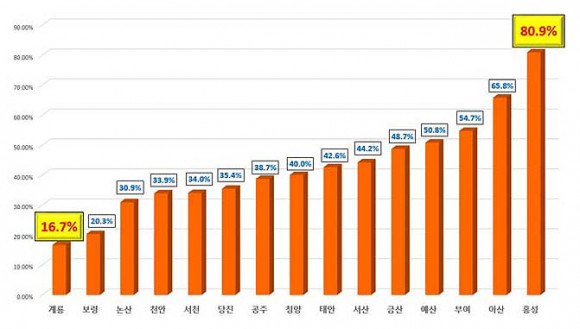 Çб³ ¼®¸é Á¦°ÅÀ²À» Áö¿ªº°·Î »ìÆìº¸¸é, È«¼º±ºÀº 80.9%Àε¥ ¹ÝÇØ °è·æ½Ã´Â 16.7%, º¸·É½Ã 20.3%, ³í»ê½Ã 30.9%·Î Áö¿ª °£ °ÝÂ÷°¡ ÃÖ´ë 5¹è¿¡ ´ÞÇÏ´Â °ÍÀ¸·Î ³ªÅ¸³µ´Ù.