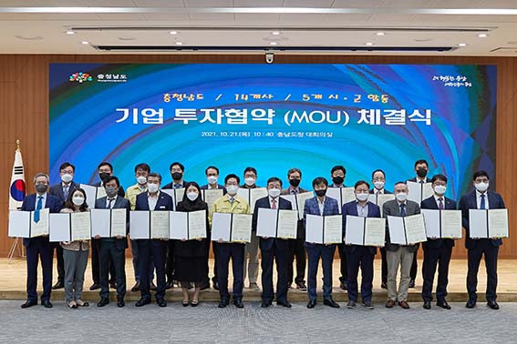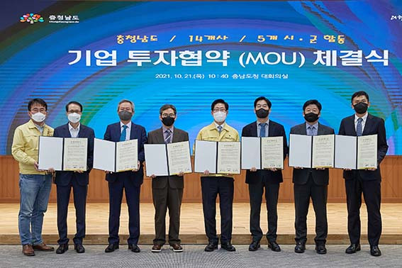À̳¯ Ãæ³²µµÃ»¿¡¼ ¡ã¢ß¿¡ÀÌÄ¡ºñ¼¼°è·Î(´ëÇ¥ ¹ÚÇö¸¸) ¡ã¢ß¹Ù¸¥ÀüÀÚ(´ëÇ¥ ¾È¿µ¹Î) ¡ã¢ßÁöº¥¿¡ÇÁ¾Ø¾¾(´ëÇ¥ ±èµ¿È£) ¡ã¢ßÁöº¥¼¼ÀÌÇÁƼ(´ëÇ¥ ±è´ëÈ£) ¡ã¹Ì·¡¸Þµð¿£ÅØ(ÁÖ)(´ëÇ¥ ¹ÚÁ¤ÈÆ) µî 5°³ ÅõÀÚ±â¾÷ÀÇ ´ëÇ¥°¡ Âü¼®ÇÑ °¡¿îµ¥ Á¦Á¶°øÀå ¹× ¹°·ù¼¾ÅÍ ½Å¼³À» À§ÇÑ ÇÕµ¿ ÅõÀÚÇù¾àÀ» ü°áÇß´Ù.